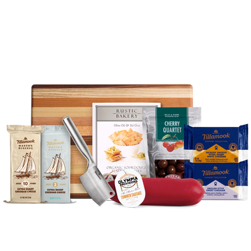Looking for the perfect gift? Our charcuterie set comes complete with a premium wood cutting board, Swissmar® Cheese Knife and our carefully curated cheddar pairings. Top it off with some savory summer sausage, crackers and cherries—just don’t forget the wine.